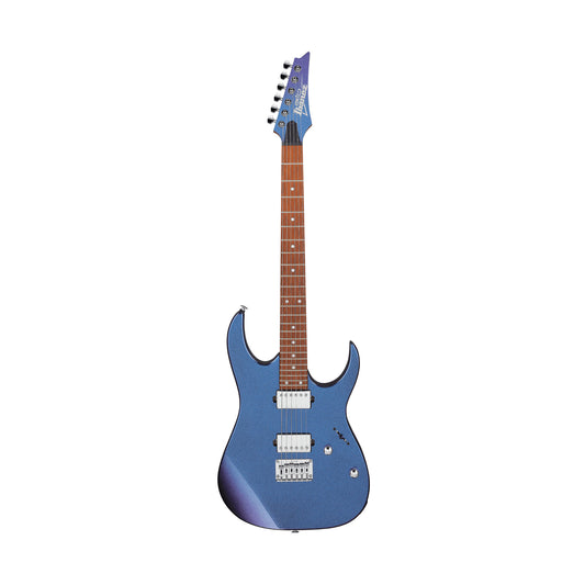 Blue Metal Chameleon is thoroughly designed for juicy riffs and merciless shredding electric guitar from the beginner-friendly Gio series. The instrument's iconic RG design relies on the familiar ergonomic contours of its poplar RG body and features a nimble Ibanez AANJ neck base that connects to the slender GRG neck made of roasted maple. For the appropriate tonal arguments, on the other hand, two IbanezClassic Elite humbuckers with nickel caps are ready, which know how to call up a tremendous variety of potential sounds thanks to 5-way pickup selector switch with interesting switching combinations. Last but not least, the Ibanez Gio GRG121SP-BMC features a solid Ibanez F106 bridge, die-cast tuners and a sensationalBlue Metal Chameleon Finish with flop effect.- RG body made of poplar