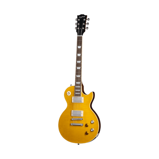 The story of “Greeny” is shrouded in mystery, but few guitars are as illustrious. Greeny is one of the most iconic original Les Paul™ Standards ever made, with a unique sound as recognizable as the guitar itself. Previously owned by Peter Green, it was used throughout his time with Fleetwood Mac and later sold to Gary Moore, who used it for three decades with Thin Lizzy and as a solo artist. Now owned by Kirk Hammett, Greeny has passed through the hands of three legendary guitarists. Its distinctive sound is partly from the out-of-phase middle switch position due to the neck pickup’s reversed magnetic polarity. The Epiphone Kirk Hammett "Greeny" Les Paul Standard is a collaboration between Epiphone and the Gibson Custom Shop. This exceptional guitar was inspired by Kirk's legendary original and allows players around the world the opportunity to experience some of the magic of "Greeny" for themselves. It features premium components, including Gibson USA Greenybucker pickups with the neck pickup reverse mounted and complete with a reverse polarity magnet, a Switchcraft® pickup selector and 1/4" output jack, CTS® potentiometers, Mallory™ capacitors, and Grover® Rotomatic® tuners with spade-style buttons on a Gibson-style “open book” headstock. A vintage-style brown and pink hardshell case is also included